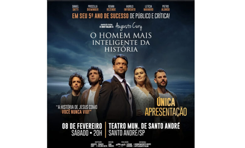 Sucesso de Bilheteira pelo País, a Peça O Homem Mais Inteligente da História terá ÚNICA APRESENTAÇÃO NO TEATRO MUN DE STO ANDRÉ no DIA 08 DE FEVEREIRO DE 2025 ÀS 20H. Após o sucesso nas livrarias ao redor do mundo, o consagrado romance sócio-emocional de Augusto Cury, considerado pelo autor uma obra vital de sua carreira, ganha sua versão teatral. Considerado o psiquiatra mais lido do mundo nas últimas duas décadas, com mais de 40 milhões de livros publicados em mais de 70 países, Augusto Cury lançou O Homem Mais Inteligente da História em 2016, após 15 anos de estudos e pesquisas sobre gestão da emoção.