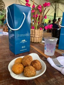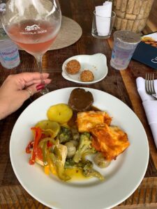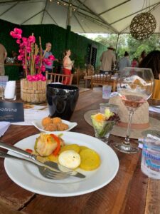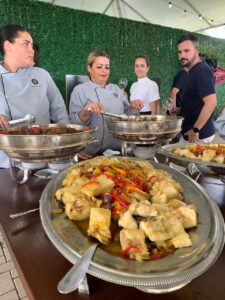 Ao chegarmos ao local do almoço, recebemos uma taça comemorativa para brindar a colheita e a pisa das uvas. O almoço, com forte influência portuguesa, foi uma verdadeira experiência gastronômica, harmonizado com os vinhos e sucos premium da Vinícola Goés, tudo à vontade e servido em meio aos parreirais, proporcionando um cenário deslumbrante.