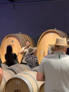 O tour pela vinícola foi guiado pelo enólogo Fábio Goés, que explicou detalhadamente o processo de produção do vinho, desde a colheita até a fermentação e o envelhecimento. Percorremos os vinhedos da fazenda, conhecendo tanto os cultivos tradicionais quanto os de inverno, e depois veio um dos momentos mais esperados: a pisa da uva, acompanhada de música ao vivo, tornando tudo ainda mais especial e animado.