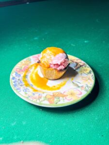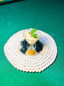Doce de Mãe Deuzinha: Uma cocada assada com canela, acompanhada de sorvete de amarena e calda quente de murici, conectando a tradição com a modernidade e fechando a experiência com chave de ouro.