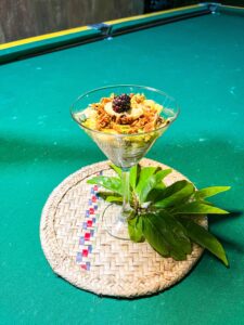 Salada Rosa de Fogo: Uma explosão de sabores adocicados e picantes, combinando maçãs, peras e sementes de aroeira. A composição remete à delicadeza e à ousadia da culinária tocantinense, onde cada ingrediente tem sua história.