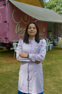 “Com o diagnóstico precoce, a chance de cura do câncer de mama é quase 100%. Por isso, é tão importante vir fazer a mamografia. O exame é tranquilo, eu fico de 8 a 10 minutos com o paciente em sala. E depois, com o resultado, o paciente terá o acompanhamento do mastologista e do ginecologista para ter o tratamento correto”, explicou a técnica de enfermagem da Carreta da Saúde, técnica de enfermagem da Carreta da Saúde, Maria Valéria, que realiza as mamografias.