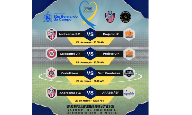 Serviço – O 1º Festival de Futsal Down de São Bernardo acontece no dia 29 de março, das 9h às 17h, no Ginásio Poliesportivo Adib Moysés Dib, que fica na Av. Kennedy, Parque Anchieta, São Bernardo do Campo. A entrada é gratuita.