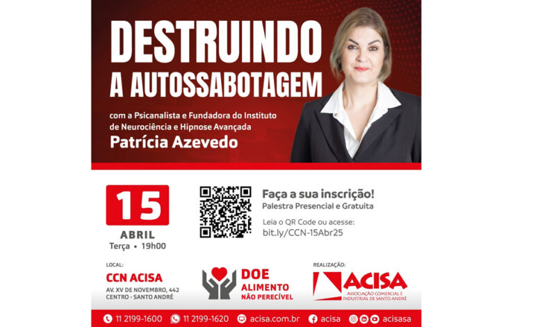 Com a proposta de auxiliar as pessoas a identificarem e superarem crenças limitantes que impactam diretamente seu desempenho e resultados na vida profissional e pessoal, a psicanalista Patrícia Azevedo ministrará uma palestra na terça-feira (15 de abril), às 19h, no Centro de Capacitação & Negócios da ACISA – Associação Comercial e Industrial de Santo André.