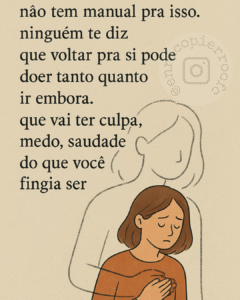 Não tem manual para isso. Ninguém te diz que voltar para si pode doer tanto quanto ir embora. Que vai ter culpa, medo, saudade do que você fingia ser. Que mesmo as versões que te machucaram deixam um tipo estranho de conforto. O conforto de saber quem você era, mesmo que aquilo fosse só um rascunho mal feito.