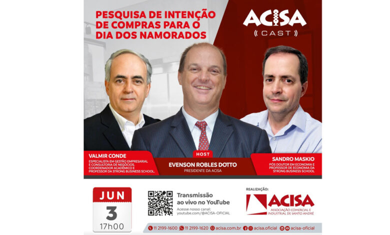 Nesta terça-feira (3), às 17h, a Associação Comercial e Industrial de Santo André (ACISA) realizará mais uma edição do seu podcast institucional – ACISA Cast – para apresentar os resultados da pesquisa de intenção de compras para o Dia dos Namorados.