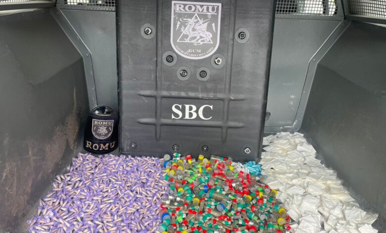 Em outra intervenção na região, a especializada da GCM de São Bernardo também prendeu um indivíduo que carregava dentro de um bolsa 88 porções de crack, 42 porções de cocaína e 68 porções de maconha, bem como R$ 78 em dinheiro trocado e uma folha com anotações da contabilidade do tráfico.