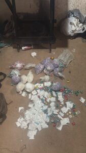 O espaço identificado pela Romu registrou a apreensão de 780 pinos de crack, 367 invólucros de maconha e 617 papelotes de cocaína, além de R$ 42,64 em espécie.