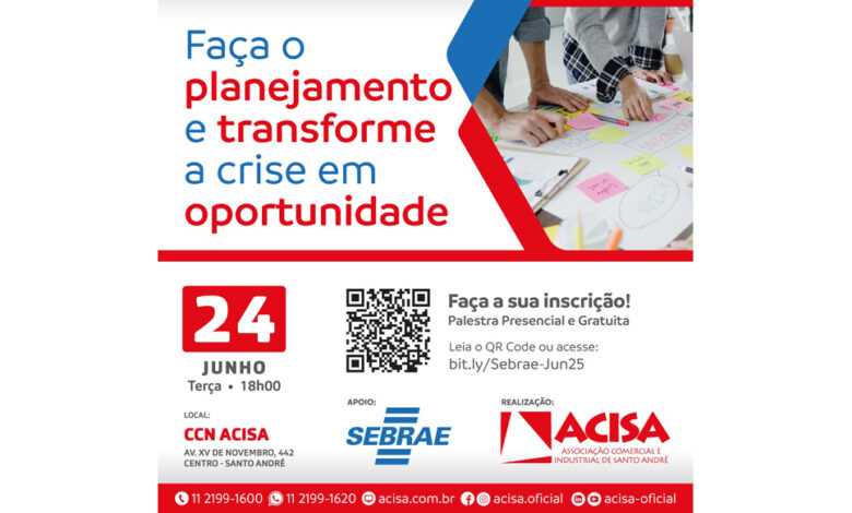 A qualificação contínua é uma das chaves para o crescimento sustentável de qualquer negócio, especialmente em tempos de incertezas econômicas. Atenta a essa necessidade e visando fortalecer a gestão empresarial, a ACISA – Associação Comercial e Industrial de Santo André, em parceria com o Sebrae, preparou uma oficina gratuita para próximo dia 24 de junho (terça-feira), às 18h, com o tema: Faça o planejamento e transforme a crise em oportunidade.