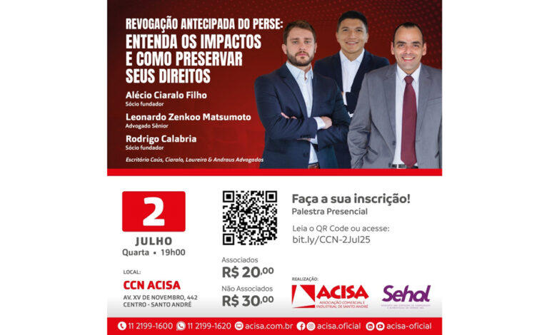 Com a finalidade de esclarecer os impactos da revogação antecipada do PERSE (Programa Emergencial de Retomada do Setor de Eventos), a ACISA (Associação Comercial e Industrial de Santo André) e o SEHAL (Sindicato das Empresas de Hospedagem e Alimentação do Grande ABC) promoverão uma palestra informativa no dia 2 de julho (quarta-feira), às 19h, no Centro de Capacitação & Negócios ACISA.
