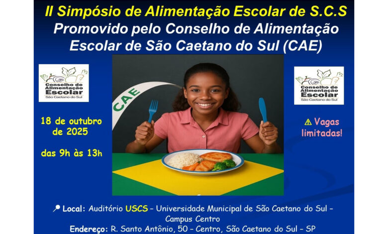 Vem ai o II Simpósio de Alimentação Escolar de São Caetano do Sul promovido pelo CAE – Conselho de Alimentação Escolar de SCS, entidade presidida pelo Professor Pará. Será no dia 18 de outubro, sábado, das 9h até 13h, tendo como local o auditório da USCS, na Rua Santo Antônio, 50, no Centro da cidade.