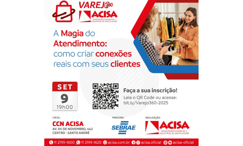 A ACISA – Associação Comercial e Industrial de Santo André inicia na próxima terça-feira (9 de setembro), às 19h, a 2ª edição da trilha de treinamento Varejo 360º, promovida pela Academia de Negócios e Inovação da entidade, em parceria com o Sebrae-SP. O evento envolve uma programação diversificada de palestras gratuitas, voltadas à capacitação da classe empresarial.