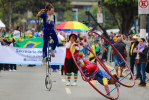 Integrantes do circo-escola deram um show à parte, ao trazerem performances de malabaristas, palhaços, pernas de pau e cuspidores de fogo à avenida.