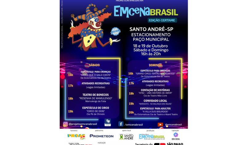 O Palco Móvel Emcena Brasil Edição Certame chega ao município de Santo André. Com seu teatro móvel, um contêiner com uma grande tenda adaptada, nos dias 18 e 19 (sábado e domingo) de outubro 2025 no Estacionamento do Paço Municipal entre 16h e 20h. O Emcena Brasil é um projeto cultural itinerante que percorre cidades do interior com um sopro de encantamento e partilha, é democrático e foi pensado para todos. Para quem nunca foi ao teatro e para quem já não vive sem ele. Para crianças que brincam de imaginar, para jovens sedentos de novas expressões, para adultos que carregam histórias e para os mais velhos, cujas memórias merecem ser ouvidas e celebradas. Por meio de uma estrutura cênica montada ao ar livre, compartilha uma programação gratuita e plural, que inclui teatro para as infâncias e adultos, teatro de mamulengo, contação de histórias, arte circense, vivências artísticas, convidado local e muito mais.