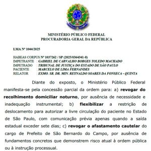 Por fim, o MPF reforça que medidas cautelares contra mandatários eleitos devem preservar o princípio democrático e a soberania popular, evitando punições antecipadas que substituam a vontade do eleitorado. “Diante do exposto, o Ministério Público Federal manifesta-se pela concessão parcial da ordem para: a) revogar do recolhimento domiciliar noturno, por ausência de necessidade e inadequação instrumental; b) flexibilizar a restrição de deslocamento para autorizar a livre circulação do paciente no Estado de São Paulo, com comunicação prévia apenas quando a saída estadual exceder sete dias; c) revogar o afastamento cautelar do cargo de Prefeito de São Bernardo, por ausência de fundamentos concretos que demonstrem risco atual à ordem pública ou à instrução processual”, concluiu Lindôra Maria Araújo.