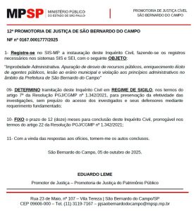 O MP – Ministério Público de São Paulo instaurou um inquérito civil para investigar o prefeito de São Bernardo, Marcelo Lima – Podemos, por suspeita de improbidade administrativa, desvio de recursos públicos e enriquecimento ilícito. A apuração, conduzida pela 12ª Promotoria de Justiça de São Bernardo, foi aberta no último dia 5 de outubro e se baseia nas revelações da Operação Estafeta, da Polícia Federal, que completou dois meses nesta terça-feira (14).