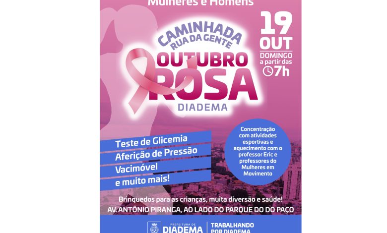A Prefeitura de Diadema promove no próximo domingo (19/10), a Caminhada Rua da Gente – Outubro Rosa, a partir das 7h, ao lado do Parque do Paço, para celebrar o Outubro Rosa, mês de conscientização sobre o câncer de mama. O evento gratuito se estende pelo período da manhã e pretende reunir toda a família para se exercitar e reforçar a importância do autocuidado e da saúde da mulher de forma mais ampla.