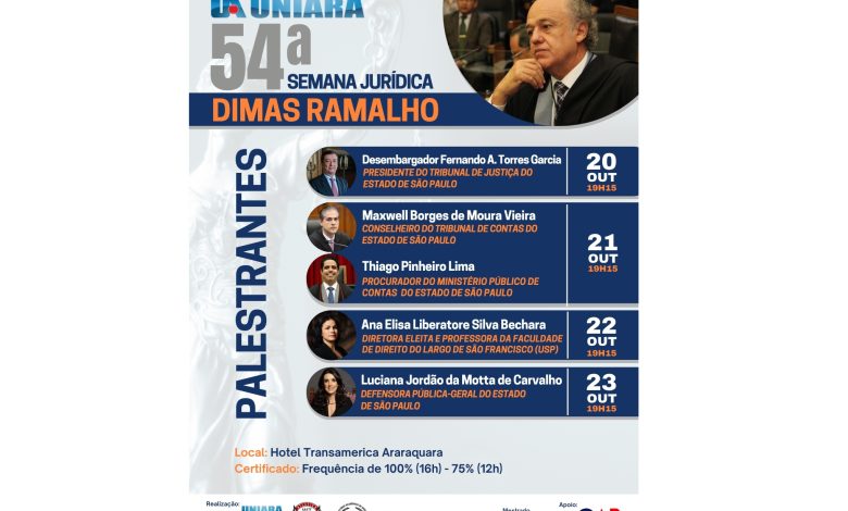 A Universidade de Araraquara (UNIARA) realizará, entre os dias 20 e 23 de outubro, a 54ª edição de sua semana jurídica, um dos eventos mais tradicionais do calendário acadêmico da região. Neste ano, o homenageado será o Conselheiro e atual Vice-Presidente do Tribunal de Contas do Estado de São Paulo, Dimas Ramalho.