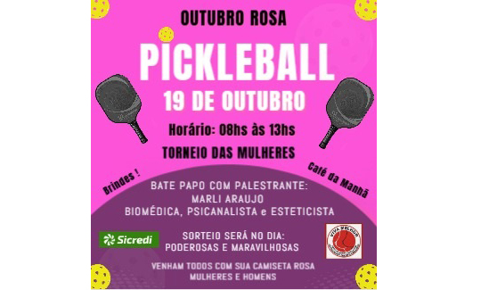 No domingo, dia 19/10 ,com a parceria da ONG Viva Melhor e da Sicredi , vamos levar para as mulheres do pickleball do Clube Atlético Aramaçan o Torneio Outubro Rosa de Pickleball. Teremos uma confraternização e uma palestra com a Dra Marli Araujo, biomédica ,psicanalista e esteticista.