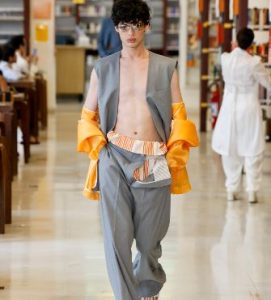 A novidade mais evidente foi o uso de cores vivas, principalmente turquesa, amarelo e laranja, além do branco, que entram no lugar dos pretos e falsos pretos comuns do repertório de ternos masculinos. Do esporte ele traz listras tipo navy, puxadores e capas tirados do paraquedismo e cintos de quimonos de artes marciais amarrados de modo a criar uma silhueta clochard nas cinturas. Tendo o conforto como bússola, ele usa ainda tecidos de camisaria para fazer paletós, calças e jaquetas.