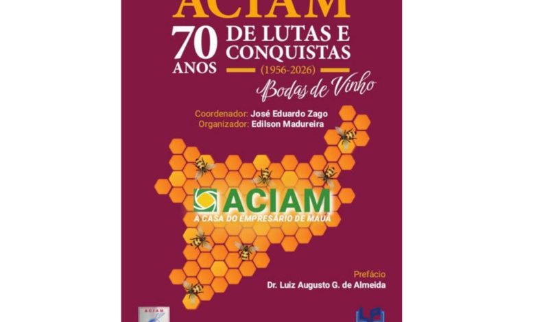 José Eduardo Zago, presidente da ACIAM – Associação Comercial e Industrial de Mauá, lança no dia 12 de março de 2026 o livro 70 anos da ACIAM – Bodas de vinho, no Monte Castelo Eventos. Além disso, a obra marca uma celebração especial para a entidade, que completa sete décadas de atividades.