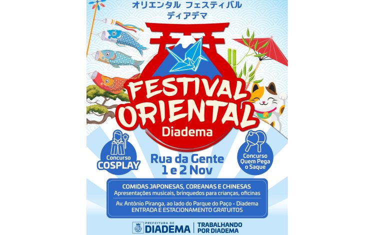 A cultura, os sabores e tradições orientais serão as estrelas em Diadema em novembro. É que nos dias 1 e 2, o município realizará o 1º Festival Oriental. O evento é uma ação da Prefeitura de Diadema e acontece na Rua da Gente, que estará decorada com elementos orientais.