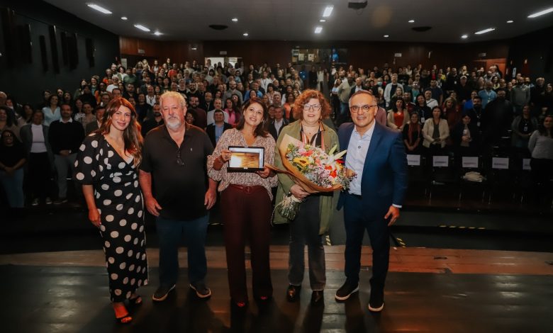 HOMENAGEM – O evento em comemoração ao Dia do Servidor Público, realizado nesta quarta-feira pela Prefeitura de São Bernardo, foi marcado por emoção com a homenagem simbólica à servidora Mônica Galetti Scudeler, de 57 anos. O prefeito Marcelo Lima, acompanhado da vice-prefeita Jessica Cormick e da secretária Renata Valdrigh, entregou placa de reconhecimento aos 30 anos de contribuições da profissional, que é técnica do Laboratório de Saúde Pública de São Bernardo, ao município.