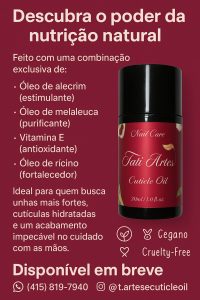 Será lançado no próximo mês (dia 15), pela técnica em unhas brasileira Tati Artese, o primeiro produto da sua linha para mãos e pés com tecnologia norte-americana e matéria prima brasileira: o Óleo de Cutícula com Vitamina E e Óleos Essenciais. A marca Tati Artese chega em pré-lançamento para clientes Vips da área de São Francisco, na Califórnia, dois dias antes, com preços promocionais.