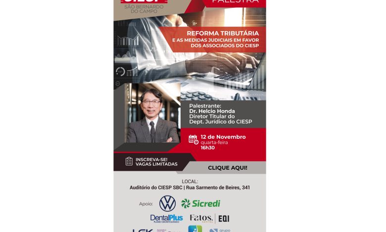 Para aprofundar o tema, o CIESP São Bernardo do Campo promove a palestra: “Reforma Tributária e as medidas judiciais a favor dos associados do CIESP, com o Dr. Helcio Honda, Diretor Titular do Departamento Jurídico do Ciesp e uma das maiores autoridades nacionais em Direito Empresarial e Tributário.