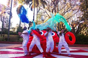 Um dos pontos centrais do espetáculo é a ocupação do espaço público. “Imaginar que podemos encontrar um polvo gigante no meio da rua ou que a rua pode se transformar num grande oceano faz parte da brincadeira de construção de novos imaginários coletivos. É um convite à utopia, à lembrança de que podemos inventar mundos e experiências coletivamente”, afirma Thais.