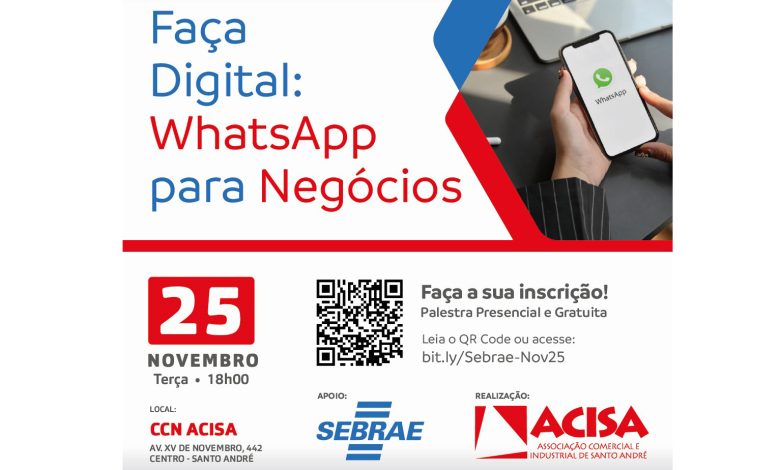 Com a proposta de auxiliar empreendedores na utilização de ferramentas digitais para ampliar seus negócios, a ACISA – Associação Comercial e Industrial de Santo André, em parceria com o Sebrae-SP, promoverá a palestra Faça Digital, WhatsApp para Negócios.