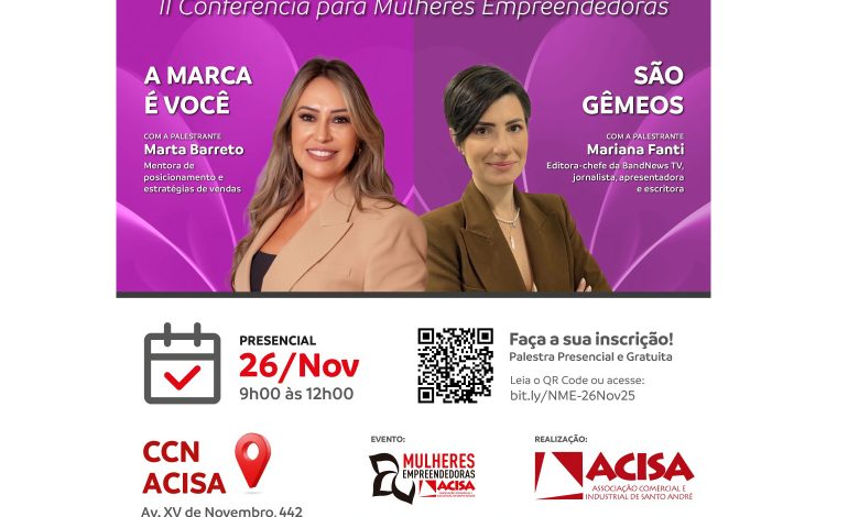 O evento é gratuito e acontecerá na quarta-feira (26 de novembro), no horário das 9h às 12h, no Centro de Capacitação & Negócios ACISA e contará com café da manhã e palestras da mentora de posicionamento e estratégias de vendas, Marta Barreto, e da jornalista Mariana Fanti.