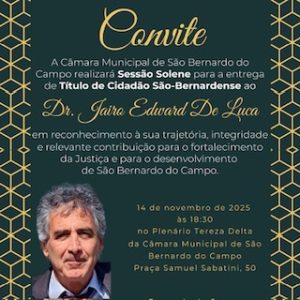 O evento é aberto ao público e será realizado no Plenário da Câmara Municipal de São Bernardo do Campo, no Paço Municipal.