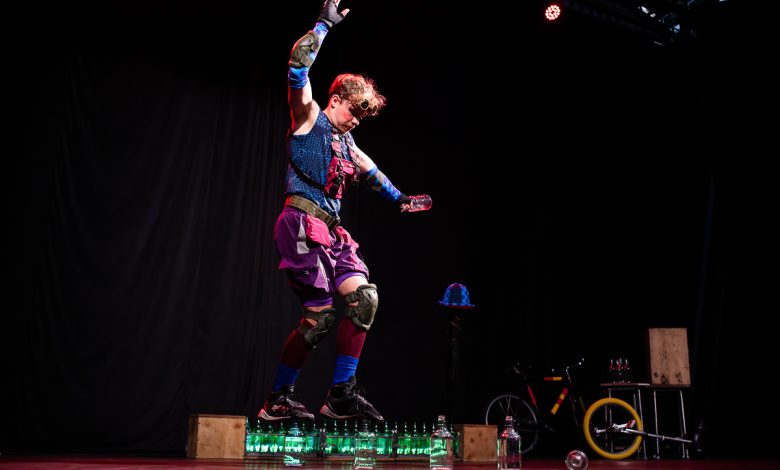 Guilherme Torres estreia número circense do Projeto Vidrado, com garrafas de vidro, monociclo e bicicleta acrobática