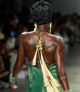 A mulher-oceano da @santaresistencia inspira a construção de algumas peças-chaves do desfile, caso dos looks feitos de escama de peixe;as três estampas centrais da coleção; e a paleta de cores, que alterna tons de pêssego, azul, verde e dourado.