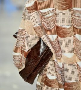 Na passarela, as franjas de palha, plissados, organzas e volumes esculturais retomam códigos já familiares da marca, mas, agora, a estilista ousa ao trabalhar com couro de salmão e as escamas de peixe cumurupim, que são aplicadas como se fossem paetês. “Os pescadores e os peixes são muito presentes na obra de Djanira, por isso trazemos isso para nossas peças”, conta @ataldatibu. As referências à artista também surgem de modo literal em vestidos fluidos estampados com suas obras — numa leitura poética da pintura que ganha corpo e movimento.