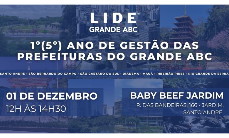 O LIDE Grande ABC realiza, no dia 1º de dezembro de 2025 (segunda-feira), em Santo André, o Almoço-Empresarial LIDE Grande ABC, das 12h às 14h45. O encontro reunirá os prefeitos das sete cidades para debater o tema “1º (5º) Ano de Gestão das Prefeituras do Grande ABC”, oferecendo um panorama atualizado das ações, desafios e resultados da administração pública regional.