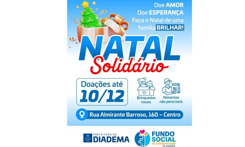 Com a aproximação das festas de final do ano, a Prefeitura de Diadema, por meio do Fundo Social de Solidariedade (FSS), está realizando a “Campanha Natal Solidário – Doe amor. Doe esperança. Faça o Natal de uma família, brilhar!”. A ação beneficente visa arrecadar alimentos não perecíveis e brinquedos novos que serão entregues às famílias carentes.