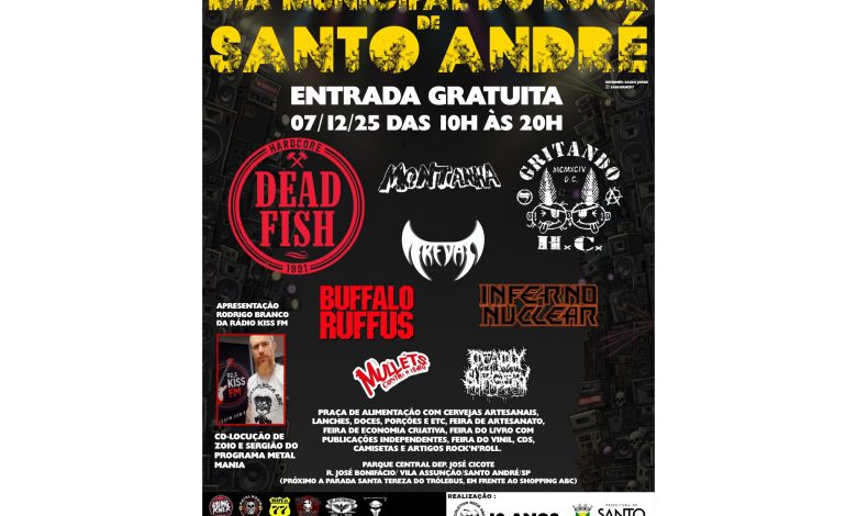 Realizado pela Secretaria de Cultura e pelo Coletivo Rock ABC, o evento terá apresentação de Rodrigo Branco, da Rádio Kiss FM, locução de Zoio e Sergião do Programa Metal Mania, e reunirá as bandas Gritando HC, Trevas, Inferno Nuclear, Buffalo Ruffus, Mullets Contra o Tédio, Deadly Surgery, Montanha e uma das bandas mais queridas do ABC, o Dead Fish.