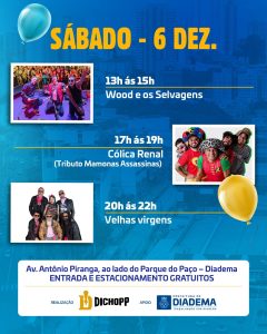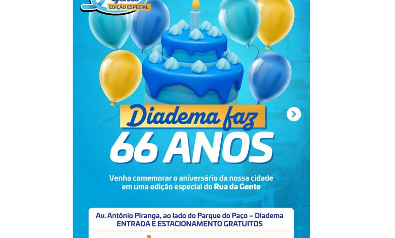 Para celebrar o aniversário de 66 anos de Diadema – dia 8/12 -, a Prefeitura preparou três dias, 6, 7 e 8 de dezembro, com muita música e magia na avenida Antônio Piranga, ao lado do Parque do Paço, durante o programa Rua da Gente (quando o trecho da via é fechado para o lazer e o esporte). A diversidade dará o tom da programação, com apresentações para todos os gostos, do rock clássico, passando pelo forró universitário e chegando até o pagode.
