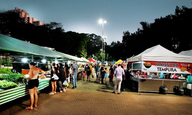 Na Feira Noturna da Praça também são comercializadas comidas típicas. Entre uma compra e outra, pode-se comer o Yakisoba, prato da culinária japonesa; o bolinho Acarajé, da cozinha baiana, e ainda lanches e doces caseiros.
