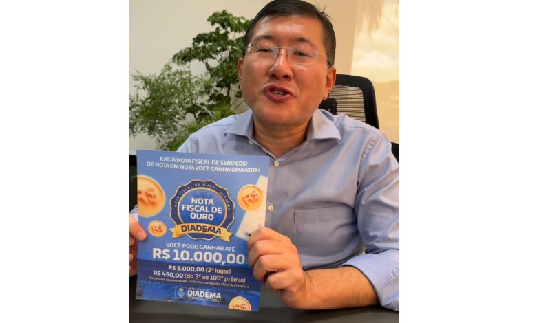 A Prefeitura de Diadema, sob a gestão do prefeito Taka Yamauchi – MDB, lançou oficialmente o programa Nota de Ouro de Diadema, instituído pela Lei nº 4.630, de 4 de novembro de 2025, com o objetivo de combater a sonegação fiscal, ampliar a arrecadação municipal e incentivar a cidadania por meio da solicitação da Nota Fiscal de Serviços Eletrônica com CPF.