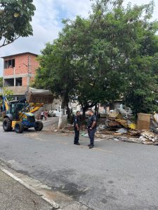 No local, foi constatado que no final de semana entulhos haviam sido descartados sobre a praça, comprometendo áreas de circulação e convivência, além de materiais deixados na rua por um morador, que utilizava indevidamente a via pública para depositar resíduos. Além da desordem urbana, a situação gerava riscos à saúde pública e prejuízos à mobilidade de pedestres.