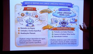 Um dos pontos centrais da palestra foi a explicação sobre o funcionamento do ChatGPT, incluindo o significado do acrônimo “Generative Pre-trained Transformer” e os princípios da arquitetura “Transformer”, baseada em mecanismos de atenção.