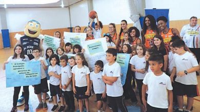 Caixa faz ação com jogadoras de basquete no colégio Petrópolis