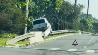 Carro fica suspenso em guard-rail após colisão na Robert Kennedy